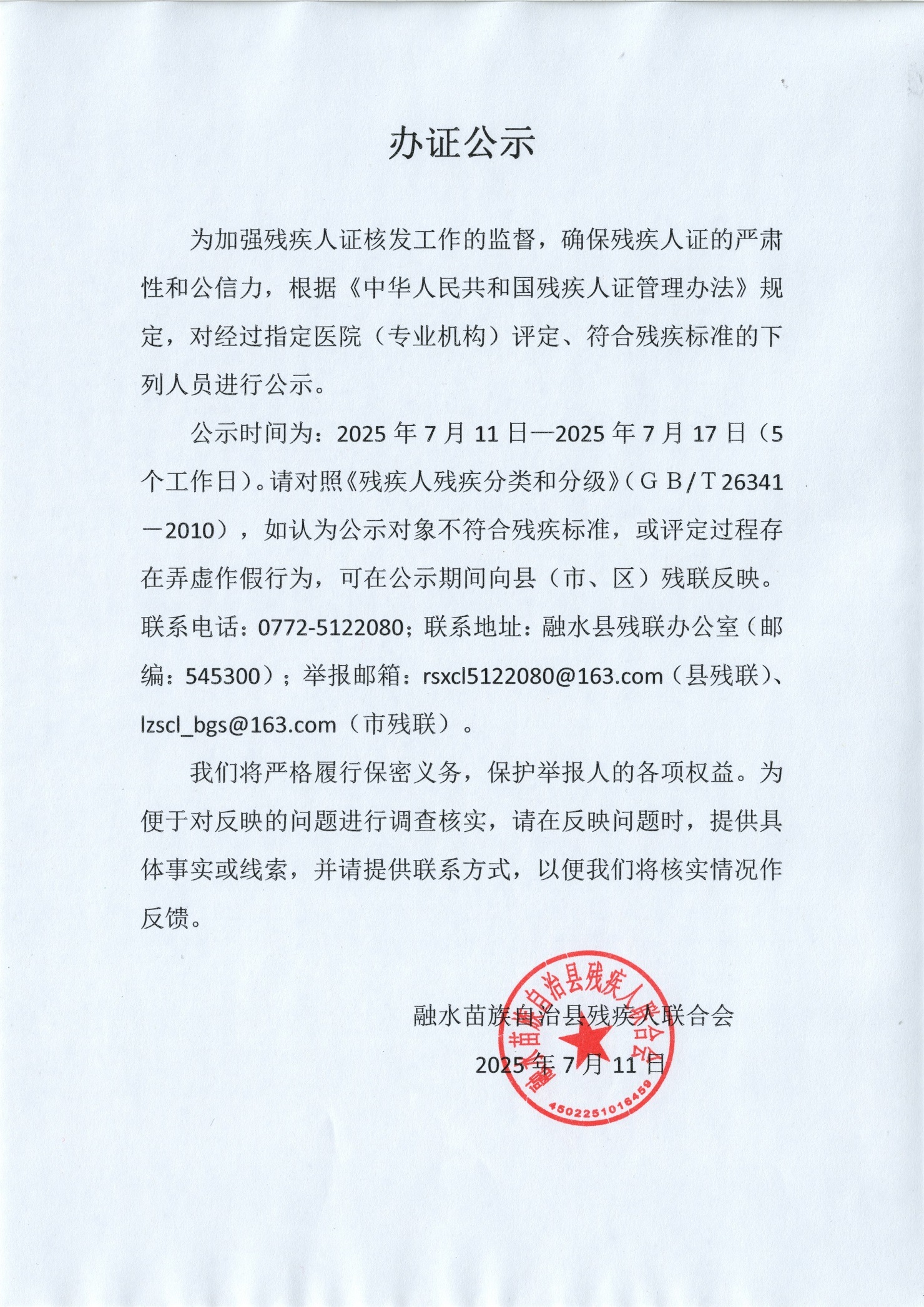殘疾人辦證公示( 2025.7.11-2025.7.17)