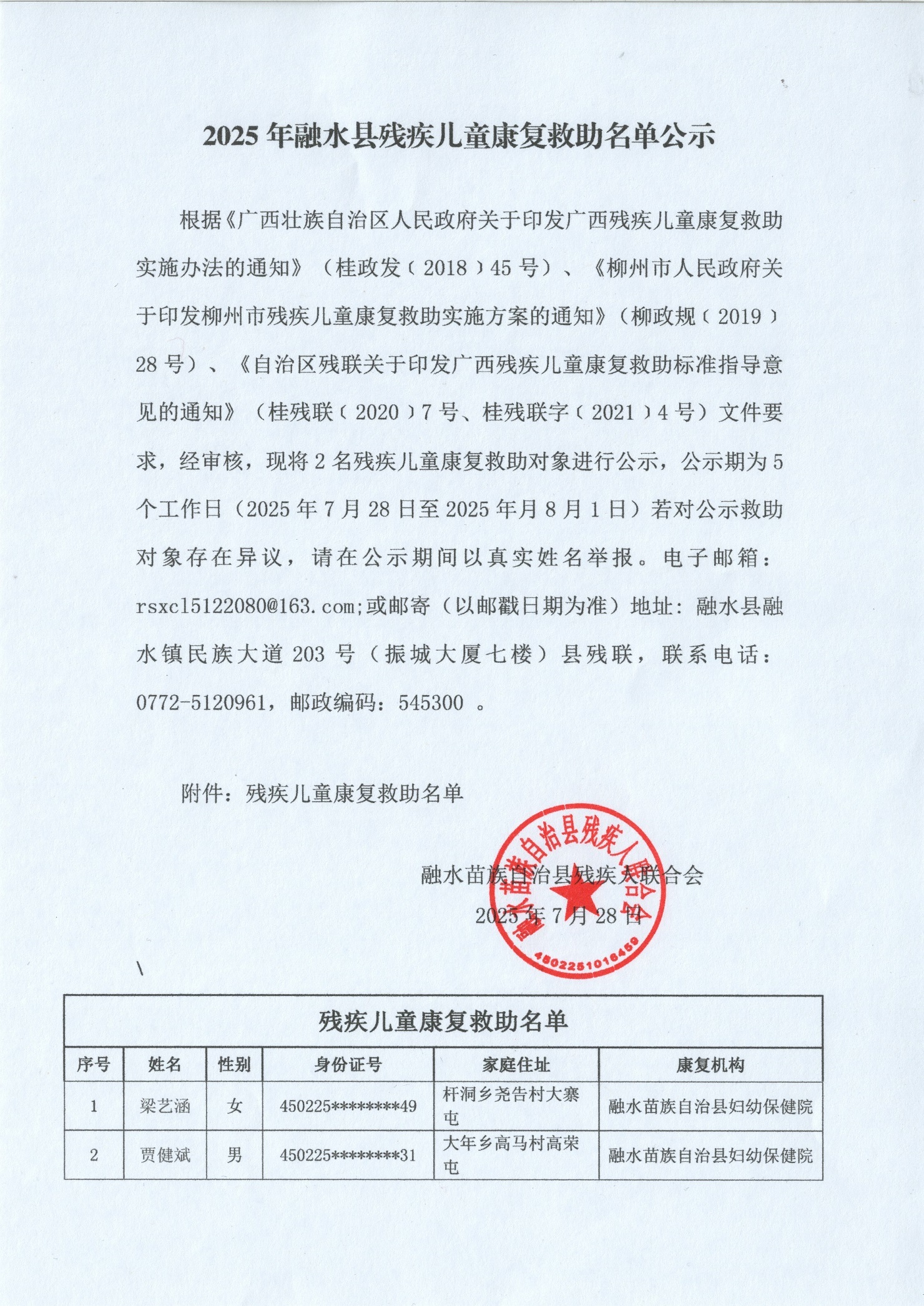 2025年融水縣殘疾兒童康復(fù)救助名單公示2025.7.28