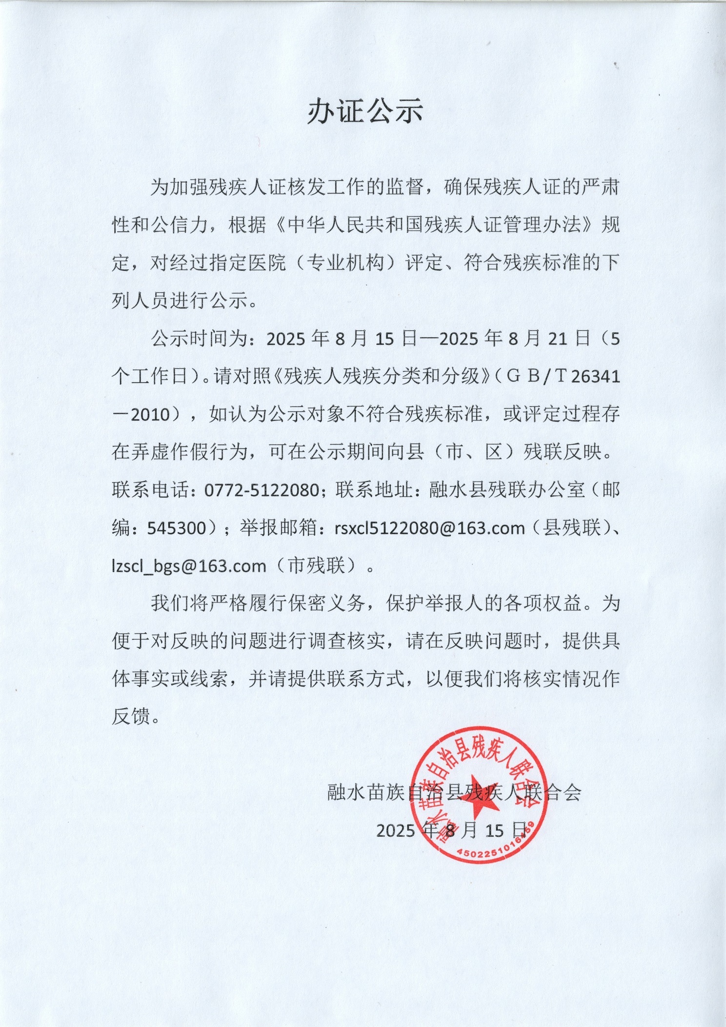 殘疾人辦證公示( 2025.8.15-2025.8.21)