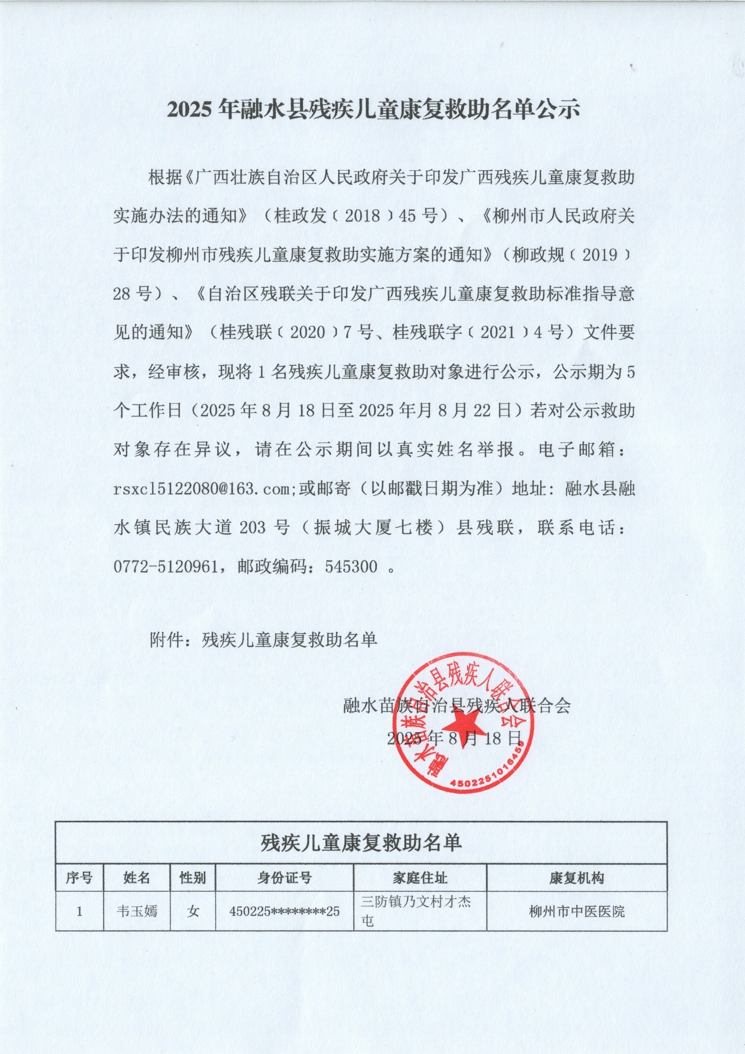 2025年融水縣殘疾兒童康復(fù)救助名單公示2025.8.18