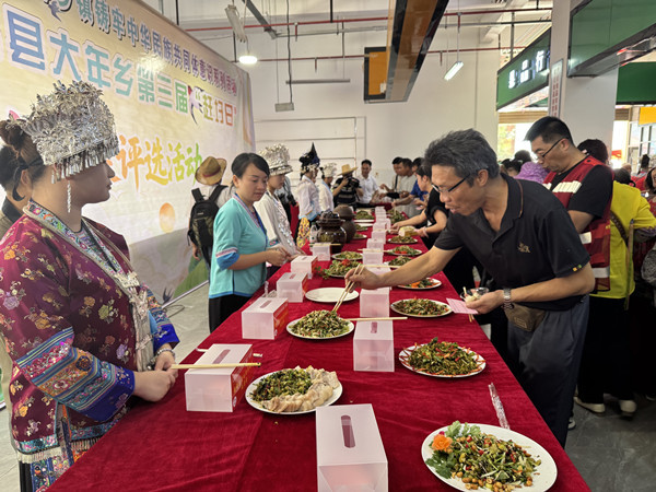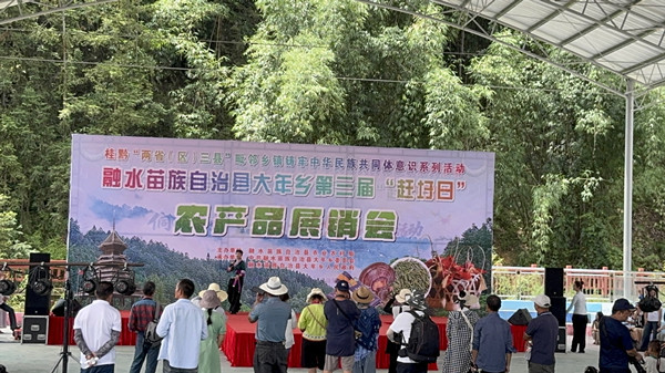 “趕圩日”活動當天,大年鄉街道人頭攢動,展銷會舞臺上身著苗族服飾的俊男靚女載歌載舞,舞臺下來自廣西的融水苗族自治縣、三江侗族自治縣、貴州的從江縣“兩省三縣”各鄉鎮的18家企業的農產品前來展銷。在農貿市場室內,當地金字招牌“大年酸菜”評比大賽也如火如荼地進行著:身著苗族服飾的參賽者捧出瓦罐酸菜,民眾翹首圍觀、駐足品嘗、踴躍投票,在酸香四溢中揭曉今年"酸菜王"冠軍得主,將活動氣氛推向高潮。