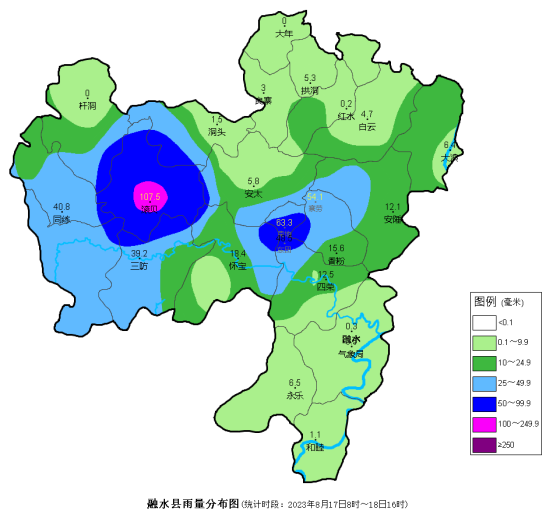 昨天白天到今天,受低層切變線影響,我縣大部出現了雷雨天氣,部分鄉鎮雨量達中到大雨,局地達暴雨。根據自動氣象站資料統計(附圖),8月17日08時~18日16時,全縣有1個鄉鎮出現了大暴雨,2個鄉鎮出現了暴雨,4個鄉鎮出現了大雨,最大雨量107.5毫米(滾貝鄉),最大1小時雨量62.2毫米(滾貝鄉,18日6時)。