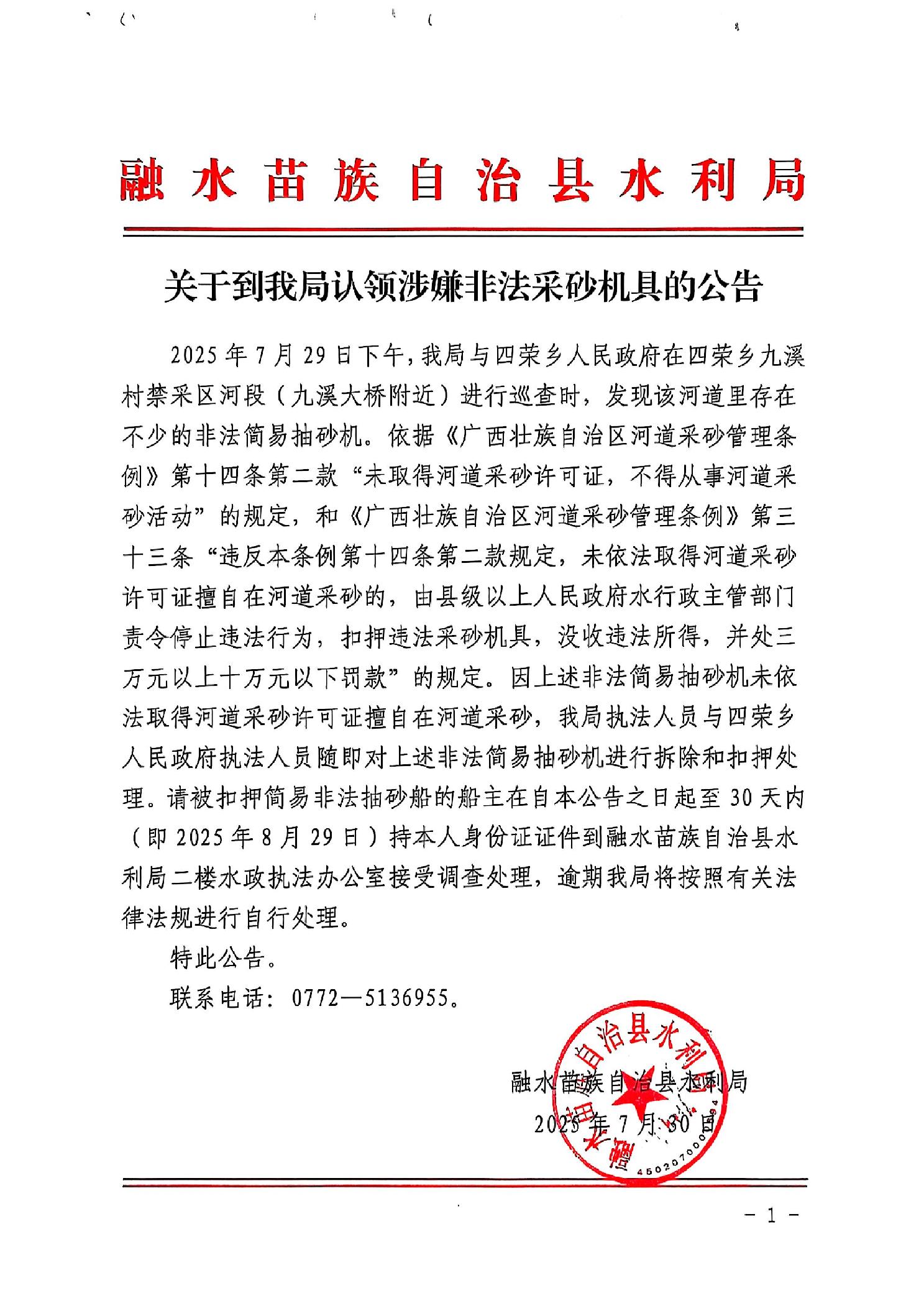 關(guān)于到我局認(rèn)領(lǐng)涉嫌非法采砂機(jī)具的公告