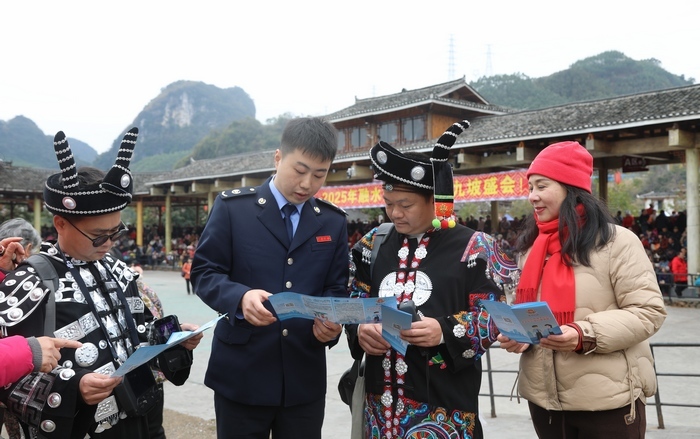 近日,廣西柳州融水苗族自治縣稅務局“藍水滴”志愿服務隊、“紅石榴”黨建服務團隊深入國家級非遺---夢嗚苗寨正月十九坡會開展“稅費宣傳進坡會”暨民族團結系列宣傳活動,借助“非遺中國年”苗族民俗坡會群這一載體,將稅費政策、黨的民族政策與傳統民俗文化相結合,將社保政策宣傳借助地方民俗表演,別出新意地將國家最新出臺的一系列稅惠政策、社保政策融合開展宣傳,送進廣大游客、群眾的心坎里。
