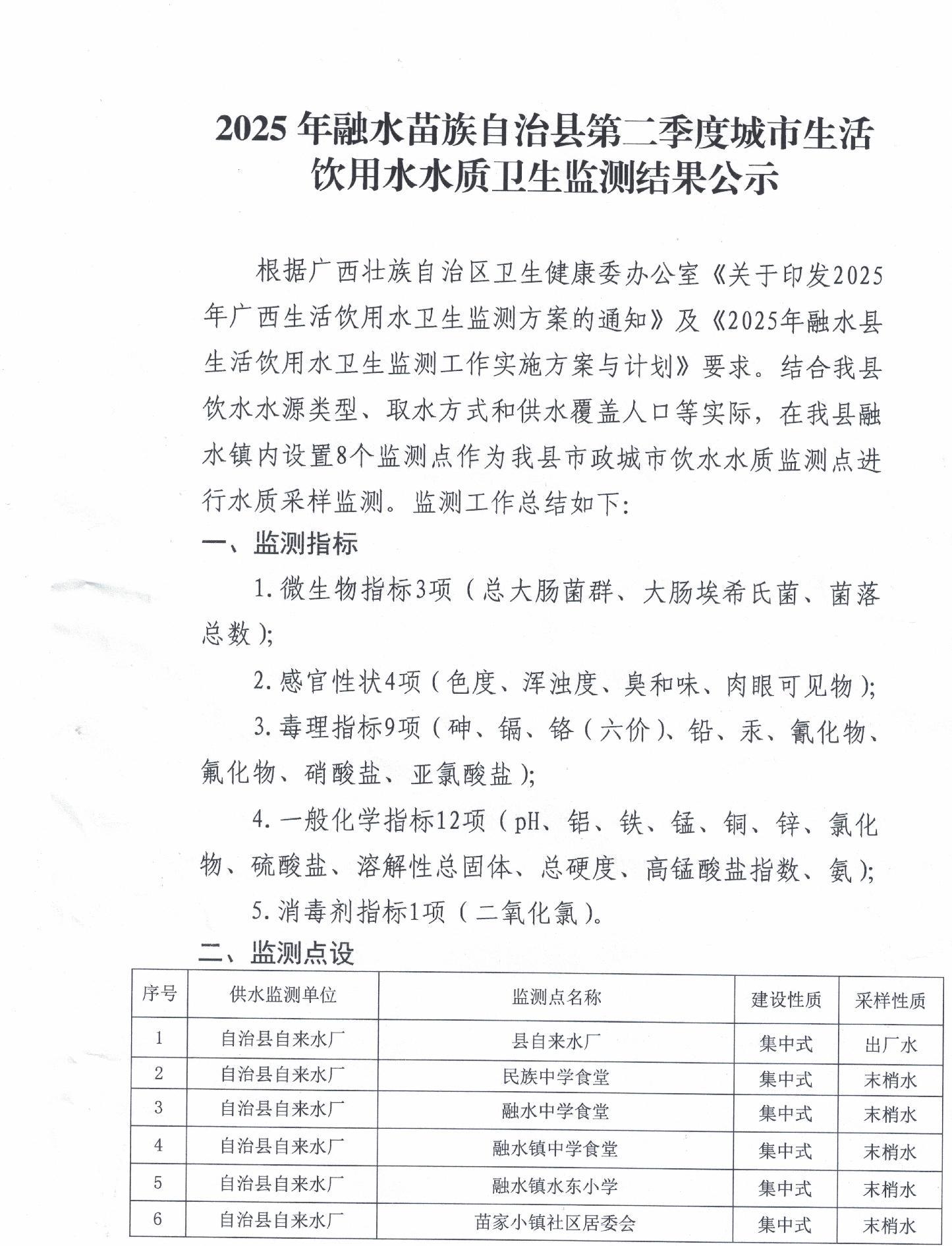 2025年融水苗族自治縣第二季度城市生活飲用水水質(zhì)衛(wèi)生監(jiān)測結(jié)果公示