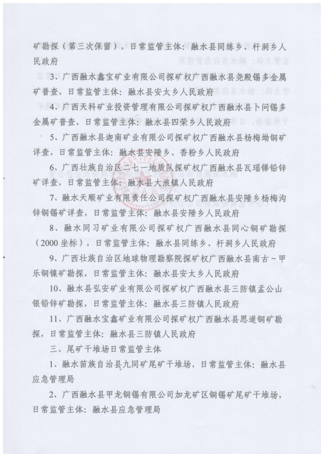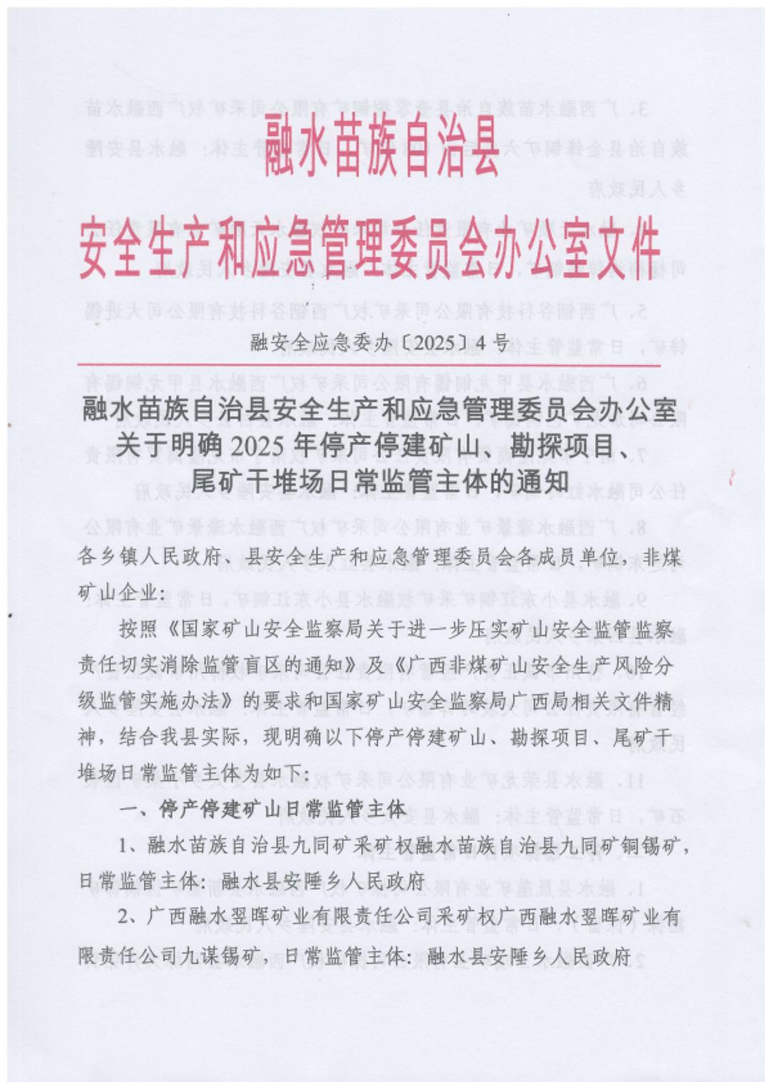 融水苗族自治縣安全生產和應急管理委員會辦公室關于明確2025年停產停建礦山、勘探項目、尾礦干堆場日常監管主體的通知