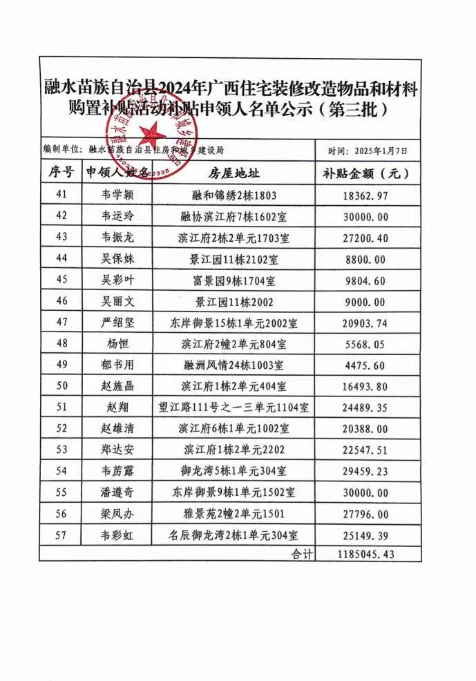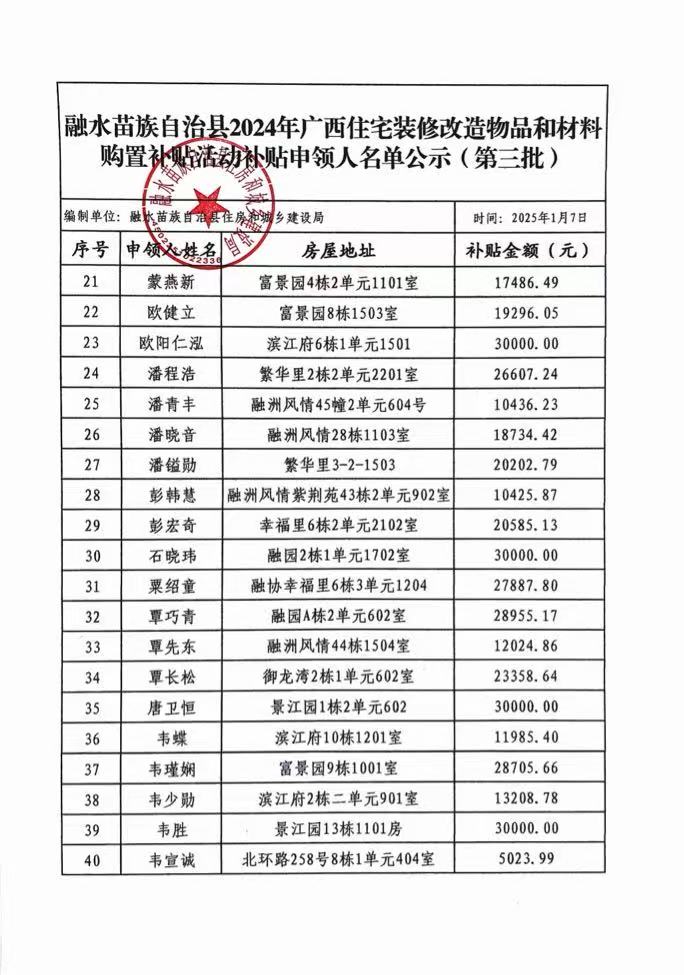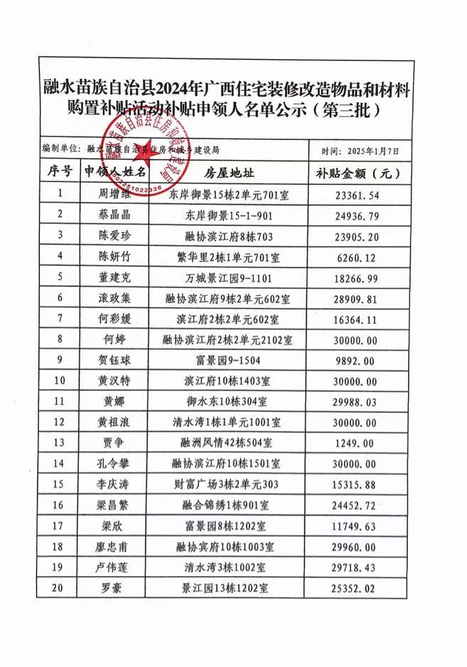 融水苗族自治縣2024年廣西住宅裝修改造物品和材料購置補貼活動補貼申領人名單公示(第三批)