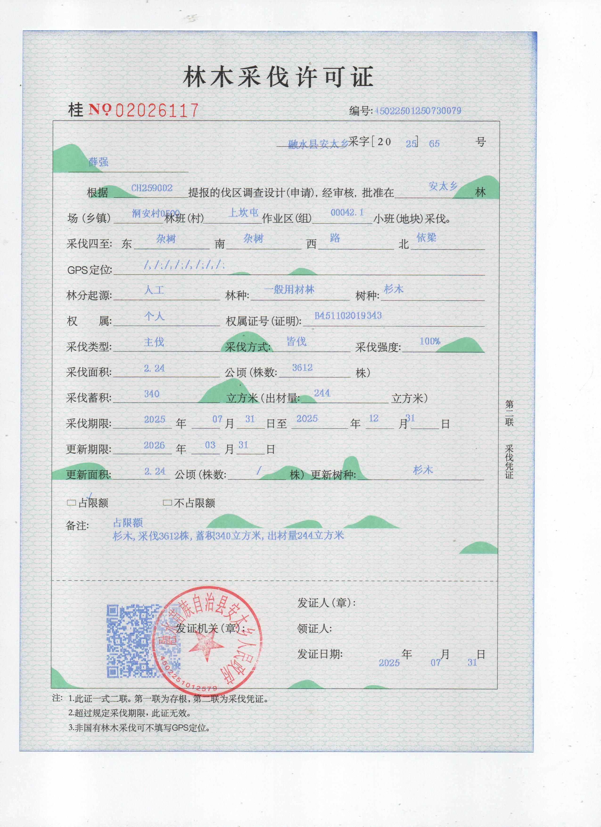 林木采伐許可證:薛強(qiáng)(桂NO.02026117) 公示