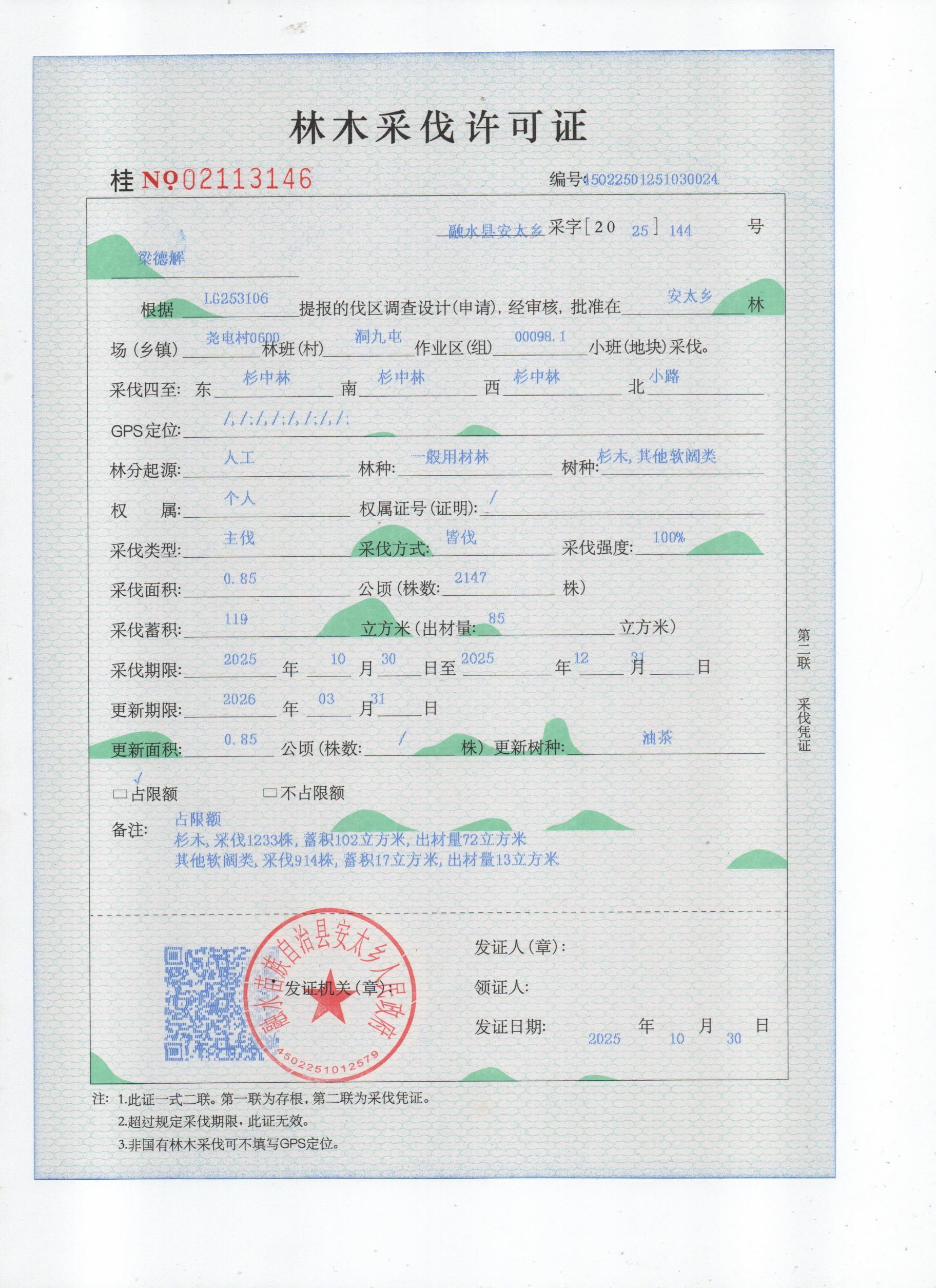 林木采伐許可證:梁德解(桂NO.02113146)公示