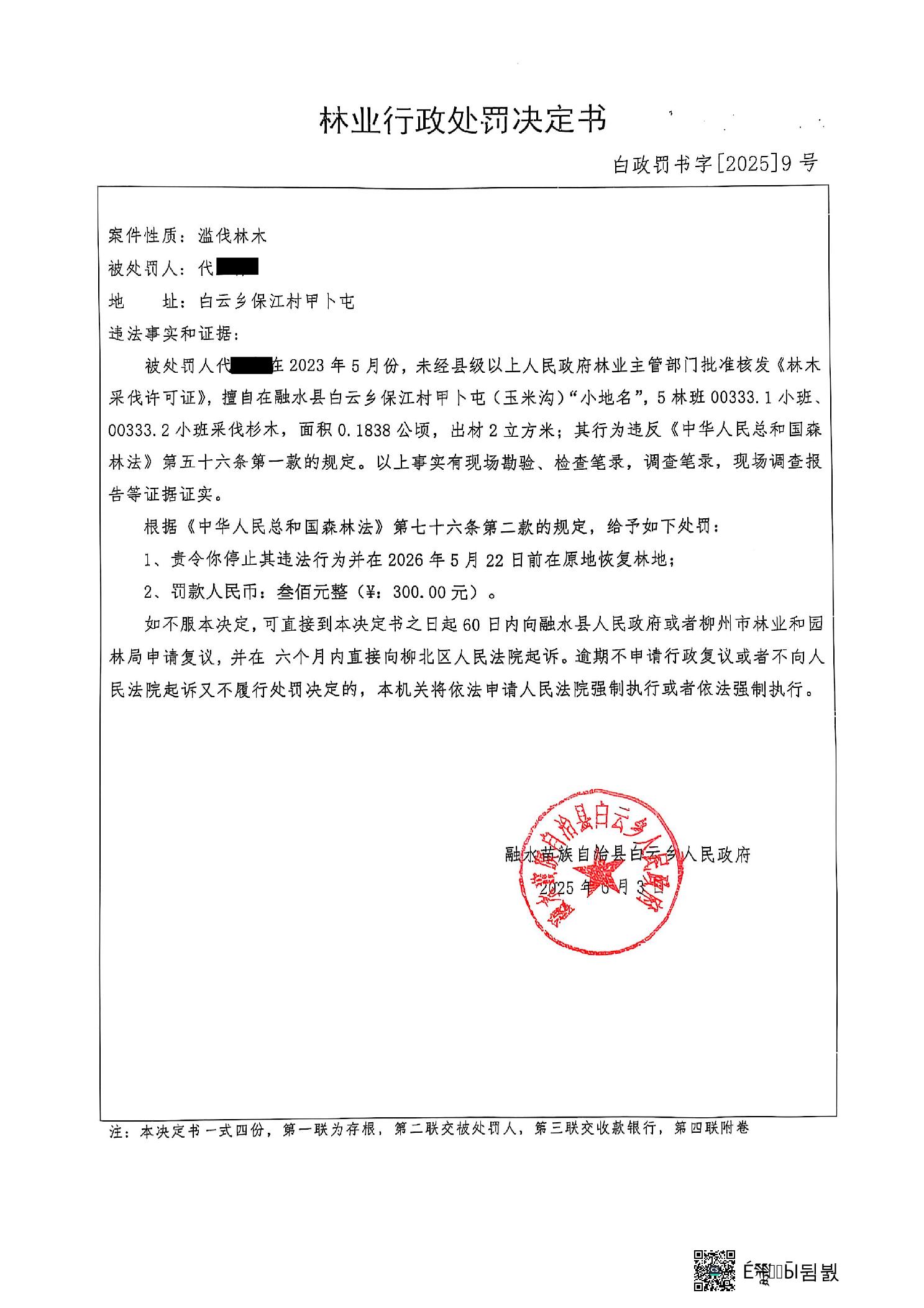 林業(yè)行政處罰決定書 白政罰書字[2025]9號