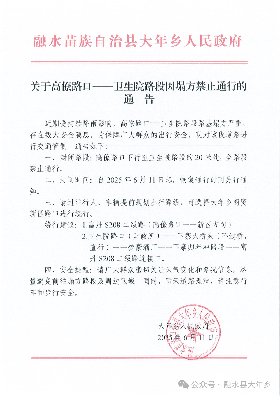 關(guān)于高僚路口——衛(wèi)生院路段因塌方禁止通行的通告