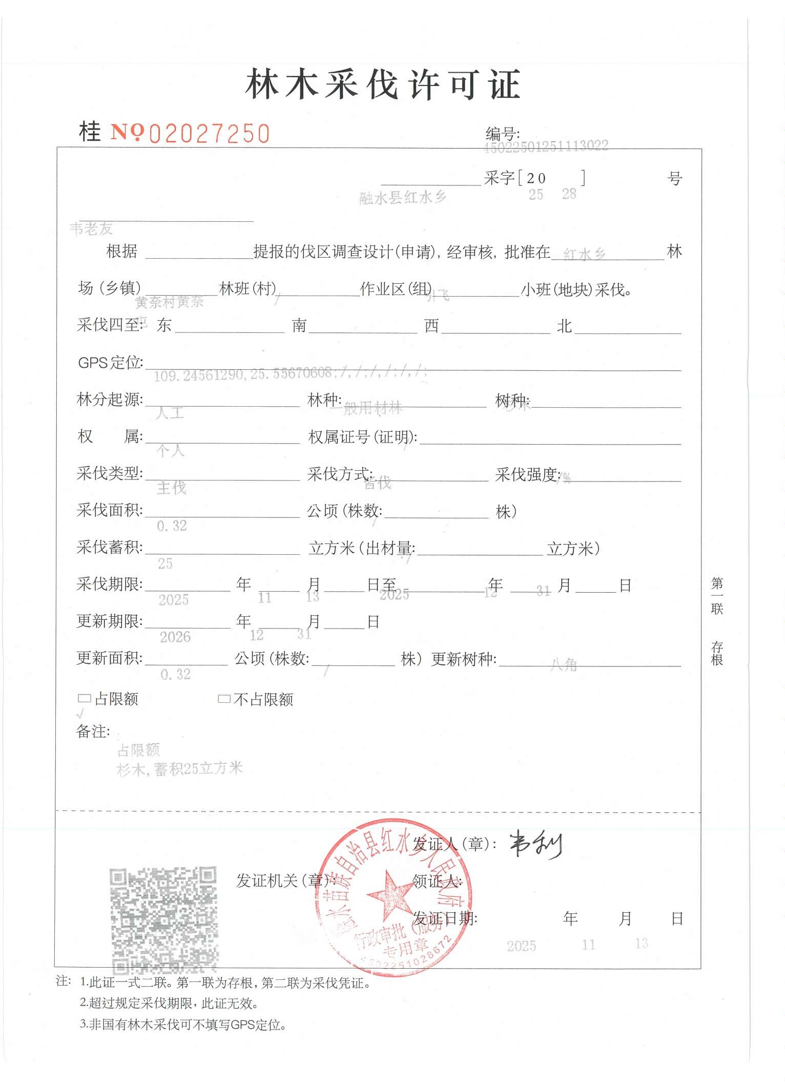林木采伐許可證:韋老友 (桂NO 02027250)