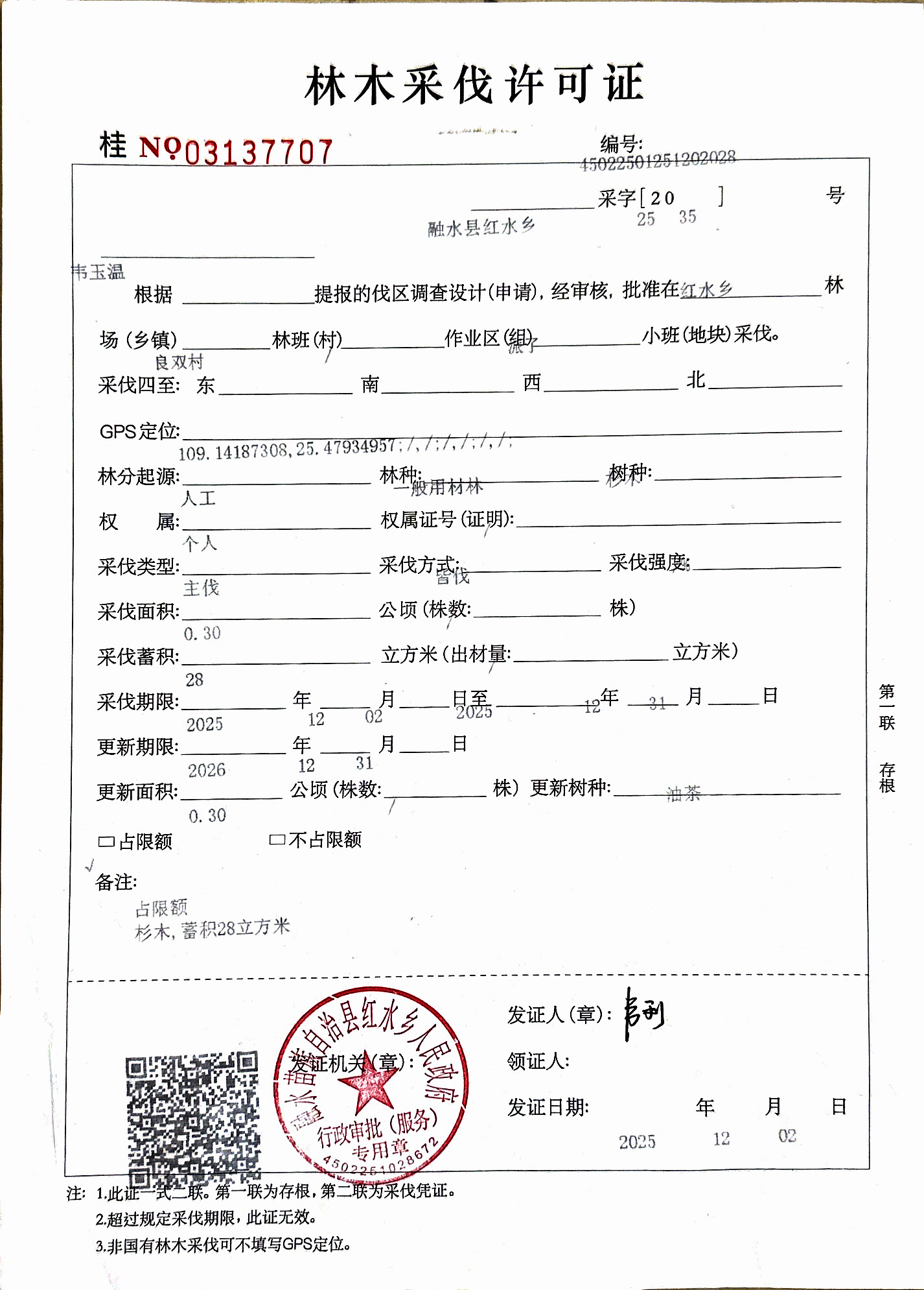 林木采伐許可證:韋玉溫 (桂NO 03137707)