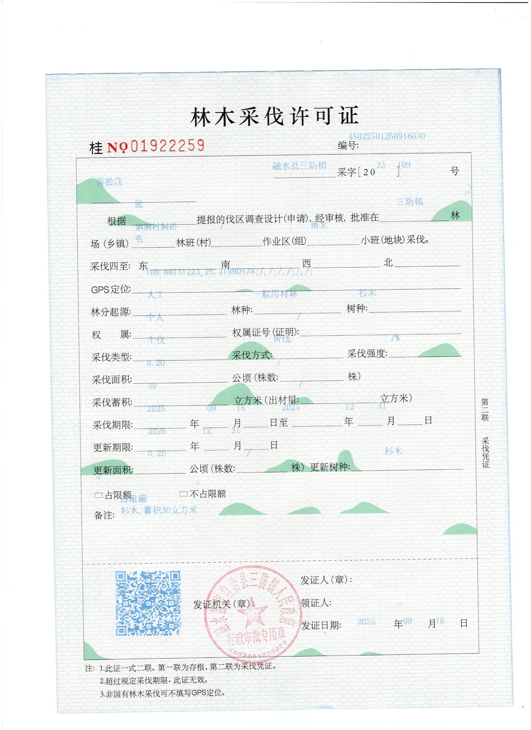 林木采伐證:蔣拾茂(桂NO.01922259)