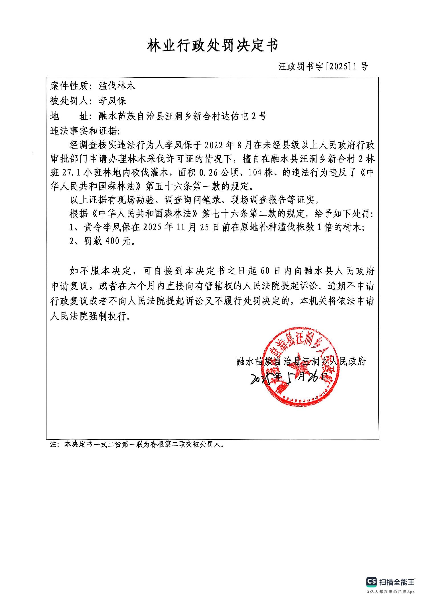 林業(yè)行政處罰決定書 汪政罰書字〔2025〕1號