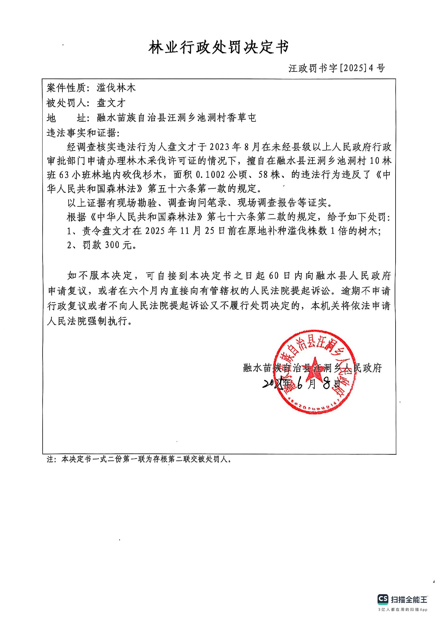 林業(yè)行政處罰決定書 汪政罰書字〔2025〕4號