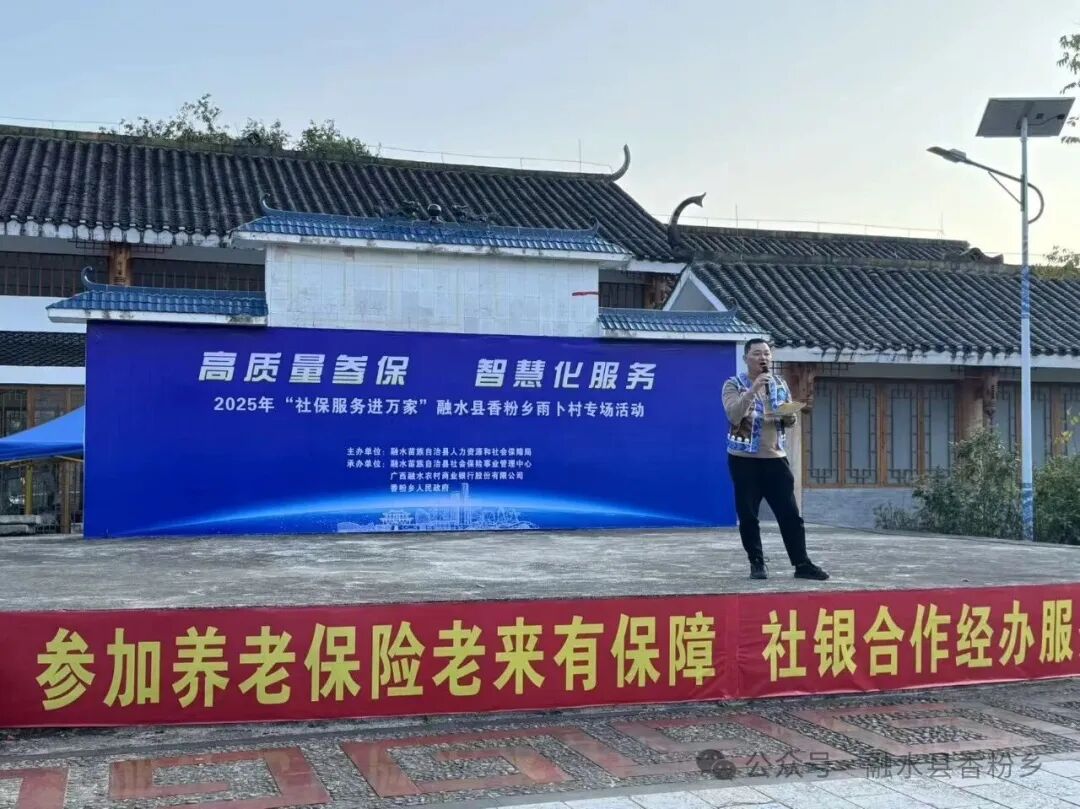 為推動(dòng)社保服務(wù)精準(zhǔn)化、智慧化,助力鄉(xiāng)村振興戰(zhàn)略落地,10月27日下午,2025年“社保服務(wù)進(jìn)萬家”融水苗族自治縣專場(chǎng)活動(dòng)在香粉鄉(xiāng)雨卜村成功舉辦。活動(dòng)以“高質(zhì)量參保,智慧化服務(wù)”為主題,通過政策宣講、互動(dòng)問答、文藝表演等形式,將社保服務(wù)送到群眾“家門口”,吸引村民積極參與。