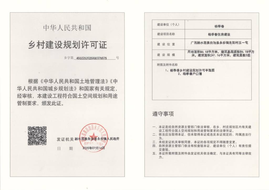 鄉(xiāng)村建設(shè)規(guī)劃許可證:(鄉(xiāng)字第4502252025XG0376575號(hào))公示